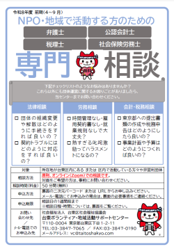 管理者からのお知らせ公開日:2026年04月01日令和8年度《NPO・地域で活動する方のための専門相談》前期(4月~9月)開催のご案内【NPO法人・社団法人・自主グループ・町会等の台東区内で活動している皆さんが対象です】